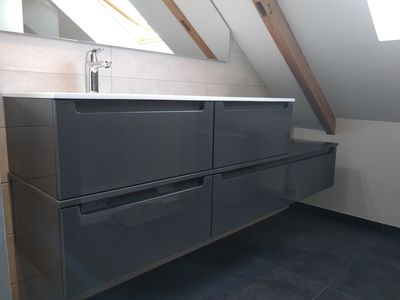 Meuble de salle de bain adapté aux besoins des parents et des enfants.