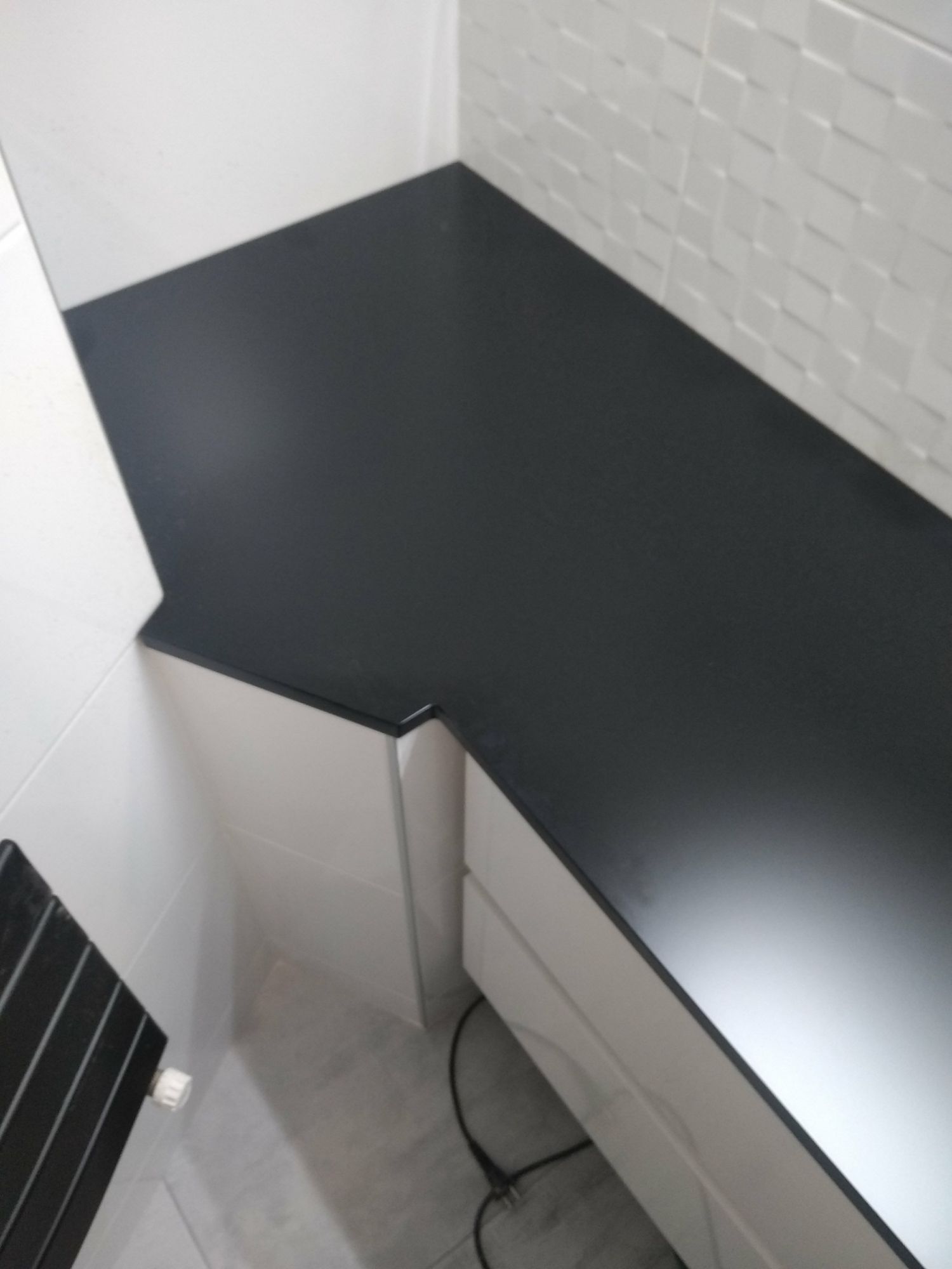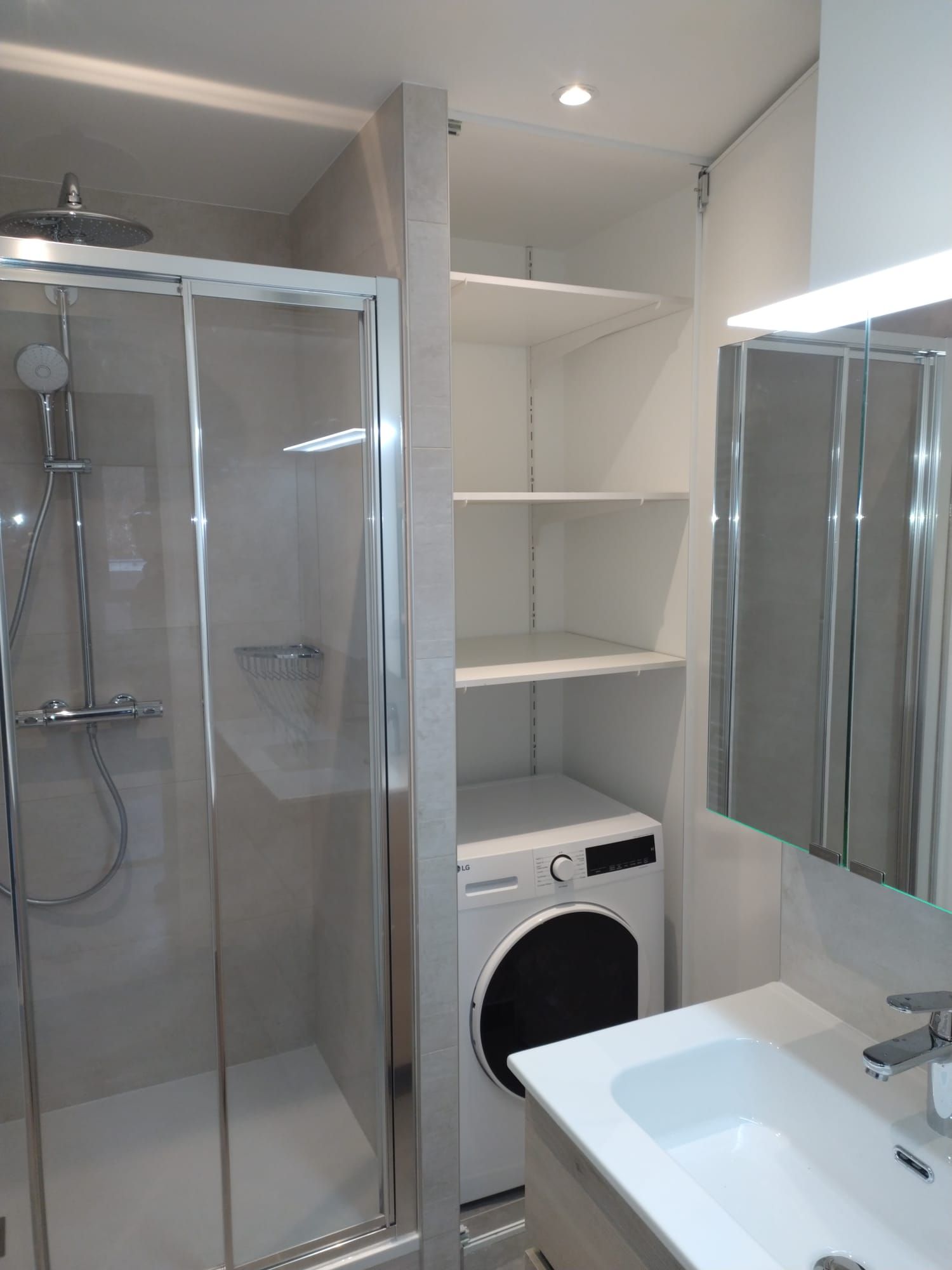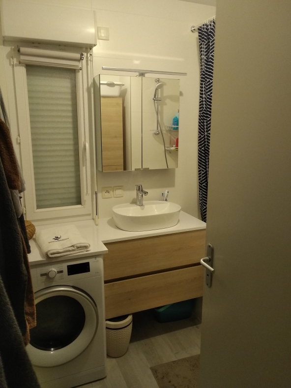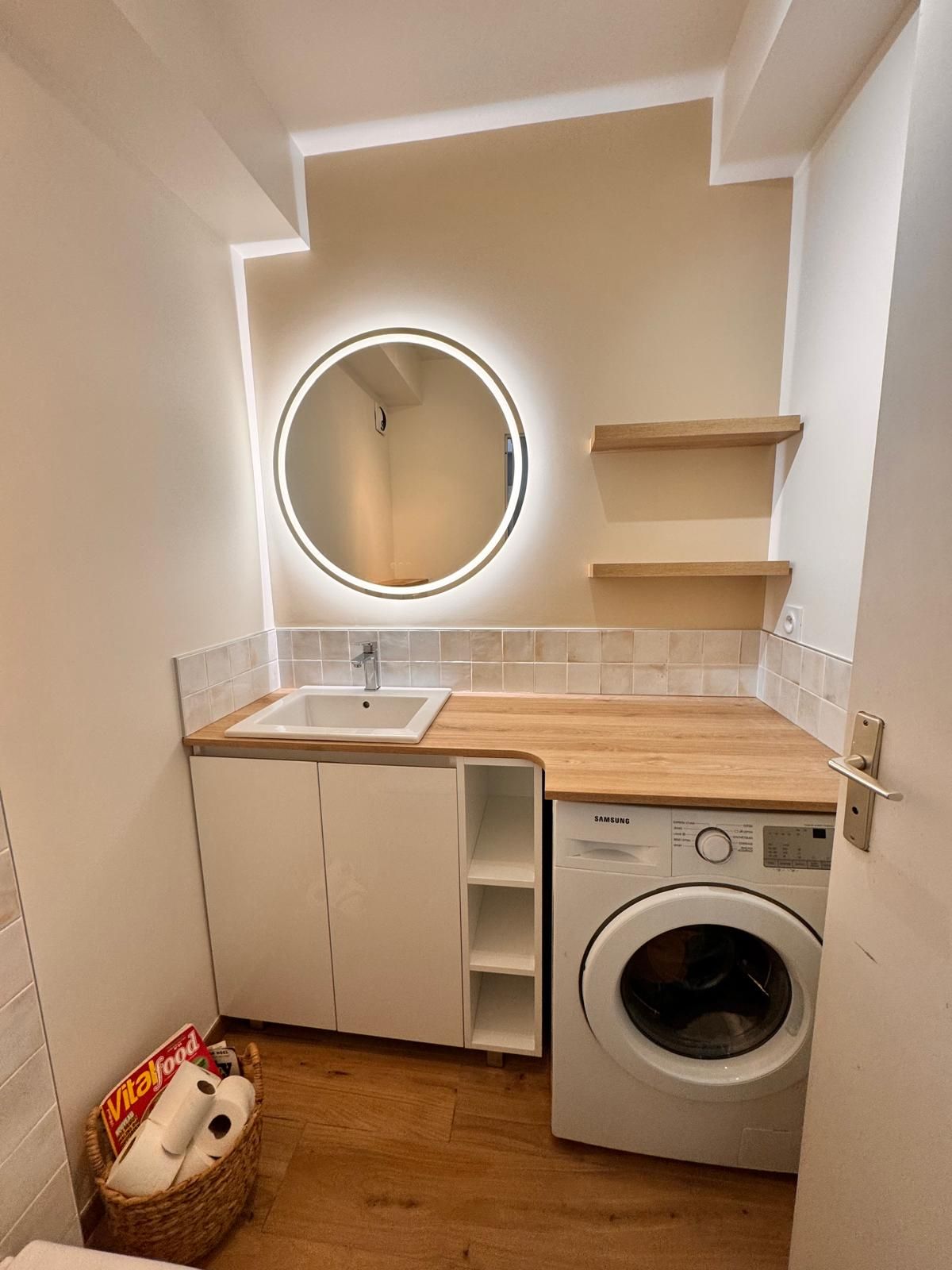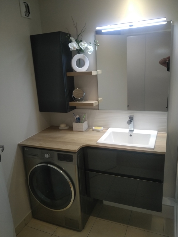 Plan de toilette intégré au-dessus de la machine à laver, pour un agencement optimal.
