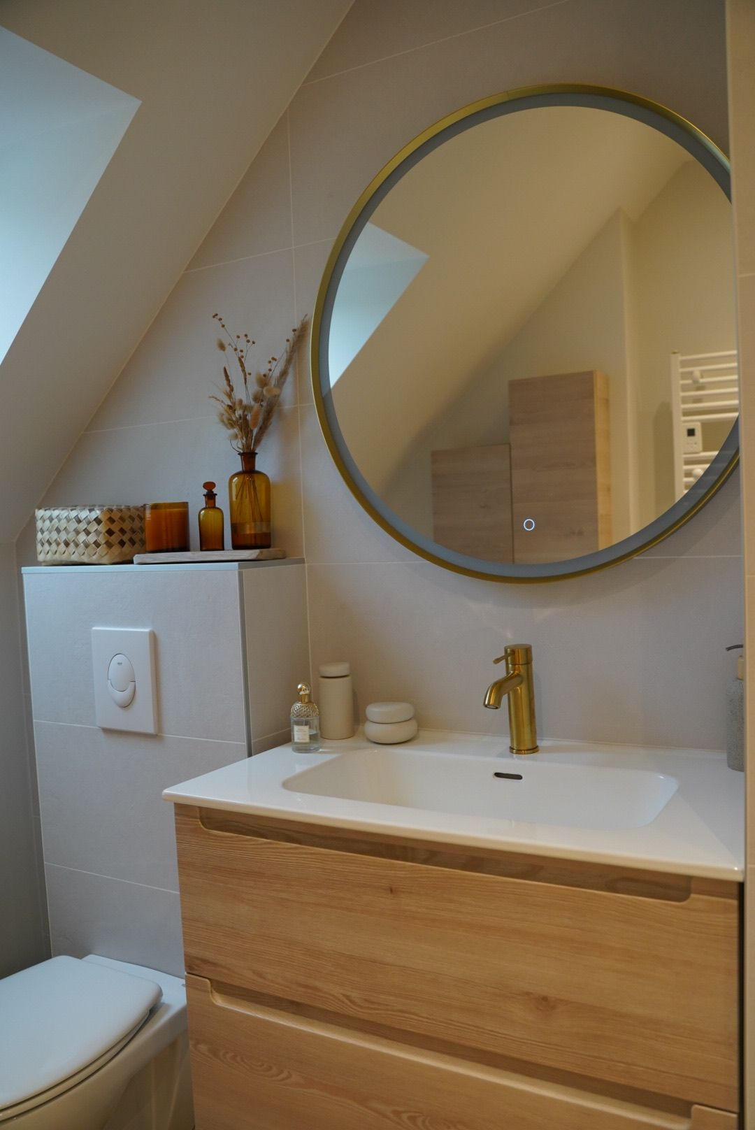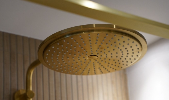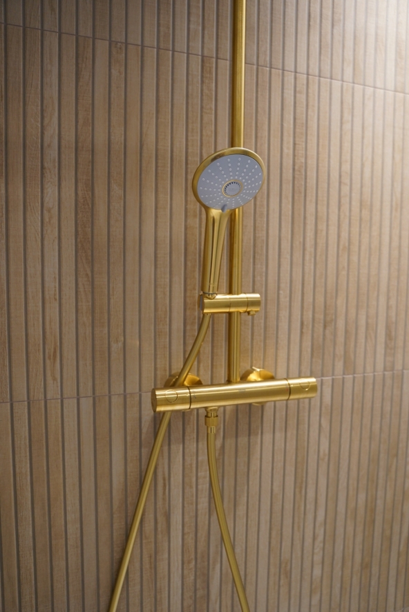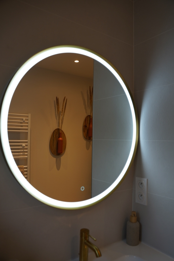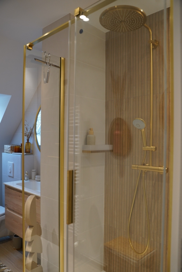 Découvrez la métamorphose de cette salle d’eau, désormais repensée pour accueillir également les WC. Les touches dorées insufflent une note de caractère et d’élégance, pour une rénovation qui respecte l’esprit de la maison tout en apportant le confort moderne recherché.