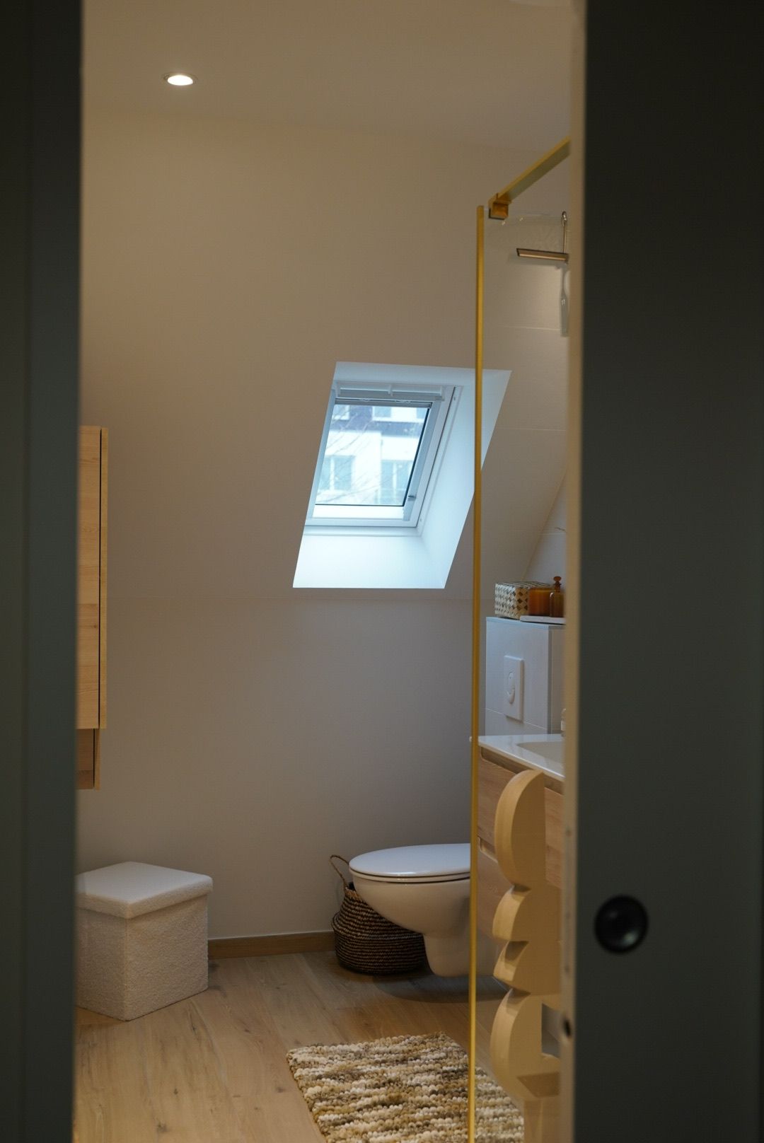 Afin d’optimiser l’espace et de créer un aménagement plus cohérent, nous avons proposé de réunir la salle d’eau et les WC en une seule pièce.