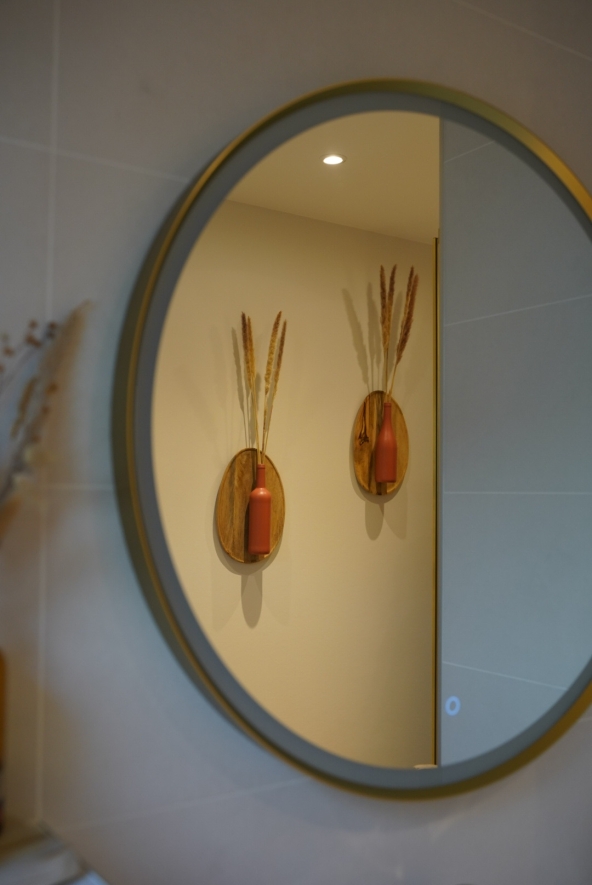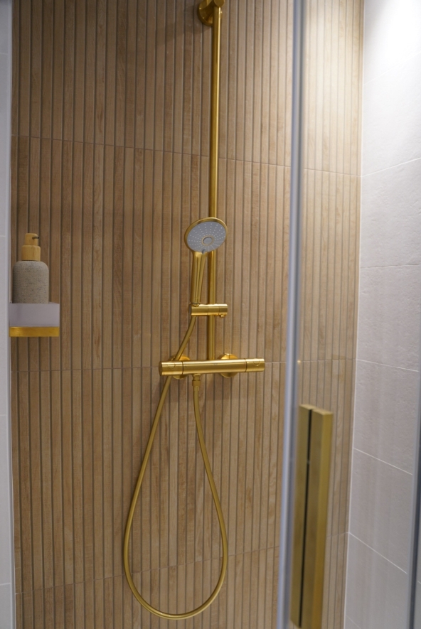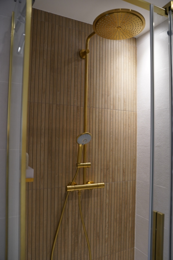 Les clients ont opté pour des finitions dorées, associées à la chaleur du bois, afin de créer une ambiance douce, apaisante et raffinée.